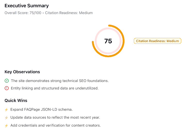 You provide a URL (and optionally keywords or a topic focus), and the agent generates a report with an overall ‘Citation readiness’ score out of 100. For codehousegroup.com, the tool returned a score of 75, classified as ‘medium’ citation readiness.