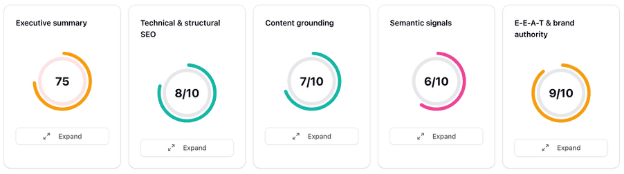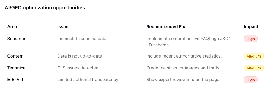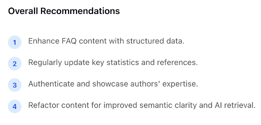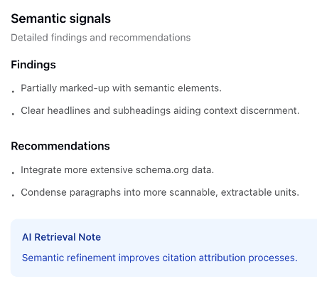 Some recommendations feel too abstract to act on. “Refactor content for improved semantic clarity and AI retrieval” sounds sensible, but what does it mean in practice? Similarly, “content lacks entity-based grounding links” requires further research to understand, let alone implement.