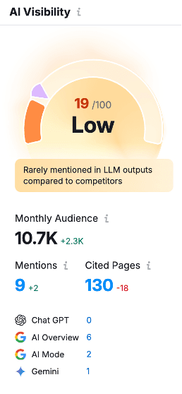 For codehousegroup.com, SEMrush returned an AI Visibility score of 19/100. The AI Search Health score was 79%, more comparable to Sitecore’s assessment.