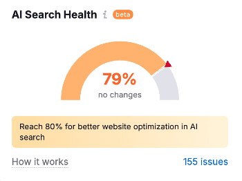 SEMrush provides two primary metrics: an AI Visibility score reflecting actual presence in AI-generated search results, and an AI Search Health score based on technical checks including whether AI search bots are blocked.