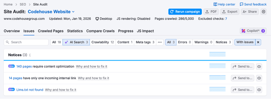 When it comes to improvement actions, SEMrush provides more limited but more specific guidance. For codehousegroup.com, it identified 140 pages requiring content optimisation, 14 pages with only one incoming link, and the absence of an llms.txt file.